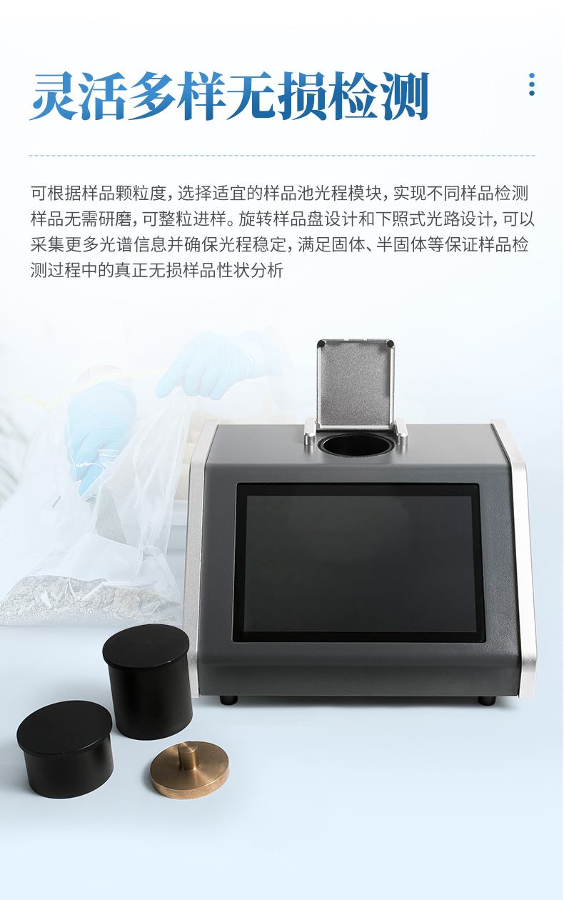 2.、旋转样品盘设计和下照式光路设计,可以采集更多光谱信息并确保光程稳定,满足固体、半固体等保证样品检测过程中的真正无损样品性状分析。